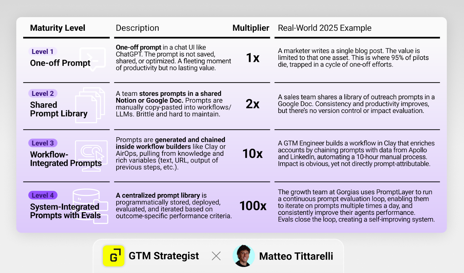 The prompt management gap: Alex Halliday, founder of AirOps, mentioned: “Your prompts are your IP — keep them optimized and manageable like an engineer would”. But instead, most GTM teams treat prompts like disposable scripts instead of strategic assets. This leads to inconsistent quality and zero reusability — a far cry from the industry benchmark of 40-60% prompt reuse that high-performing teams achieve.