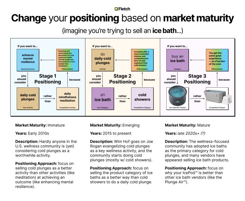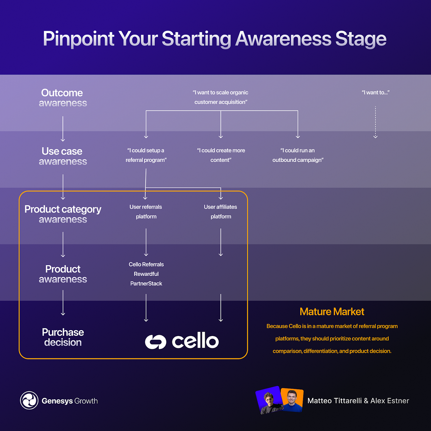- Emerging market: start from Product Category Awareness. If you’re in an emerging market and your product category is rising as a better way to reach an outcome, you need to convince your market your product category is the go-to alternative. For example, in the case of Cello which is targeting founders looking to scale their organic acquisition, they might want to create a program around why a user referral program is the best way to do so compared to other alternatives like SEO or outbound.