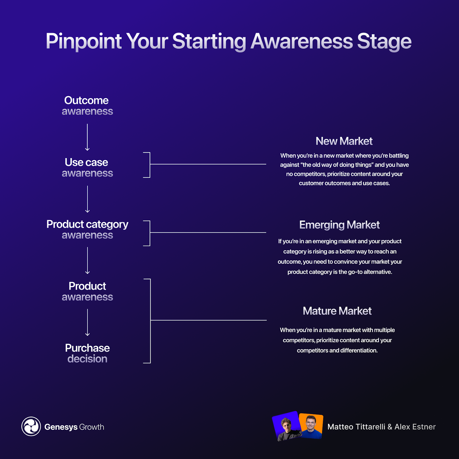 As mentioned above, most marketers and advisors will tell you: “Start creating BOFU (bottom of the funnel) content.” In our opinion, it’s not that easy, but it depends on the awareness stages of your prospect and the maturity of your market.