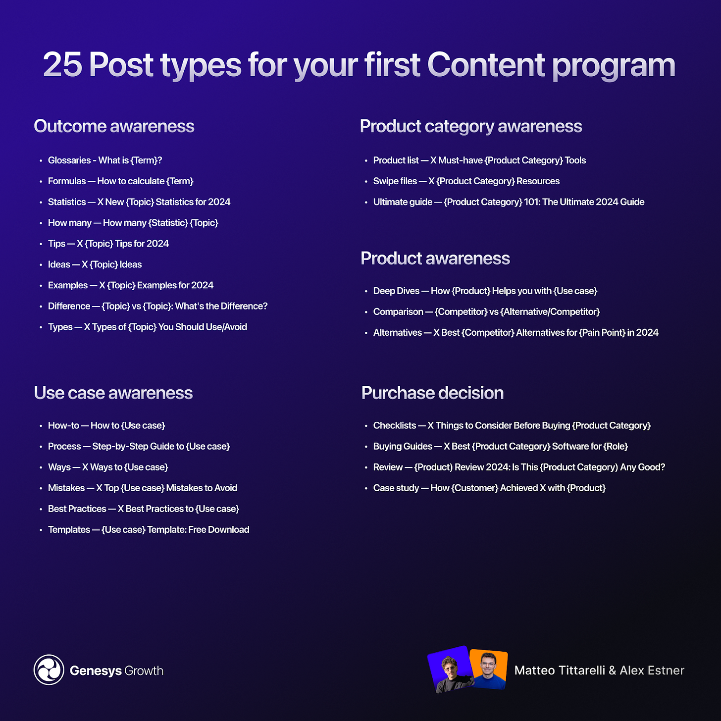 Note: if you’re asking “What about keywords and SEO?”. Our view is that content is the art, and SEO is the science — the former answers nuanced questions, influences decisions, and builds brand credibility; the latter appeals to search engines and social algorithms to rank or distribute your content in front of your audience. With the rise of AI and the fine-tuning of search algorithms, SEO has been shifting from a keyword-based to a topic-based approach. And because of this, it’s important to invest in building topical authority as opposed to just blandly “target keywords”. By creating content around customer outcomes following your buyer’s journey and their level of maturity, you’ll be able to build topical authority because the algorithm will create content series around a specific topic (eg. outcome, use case, product category, etc.), boosting your authority around that topic.