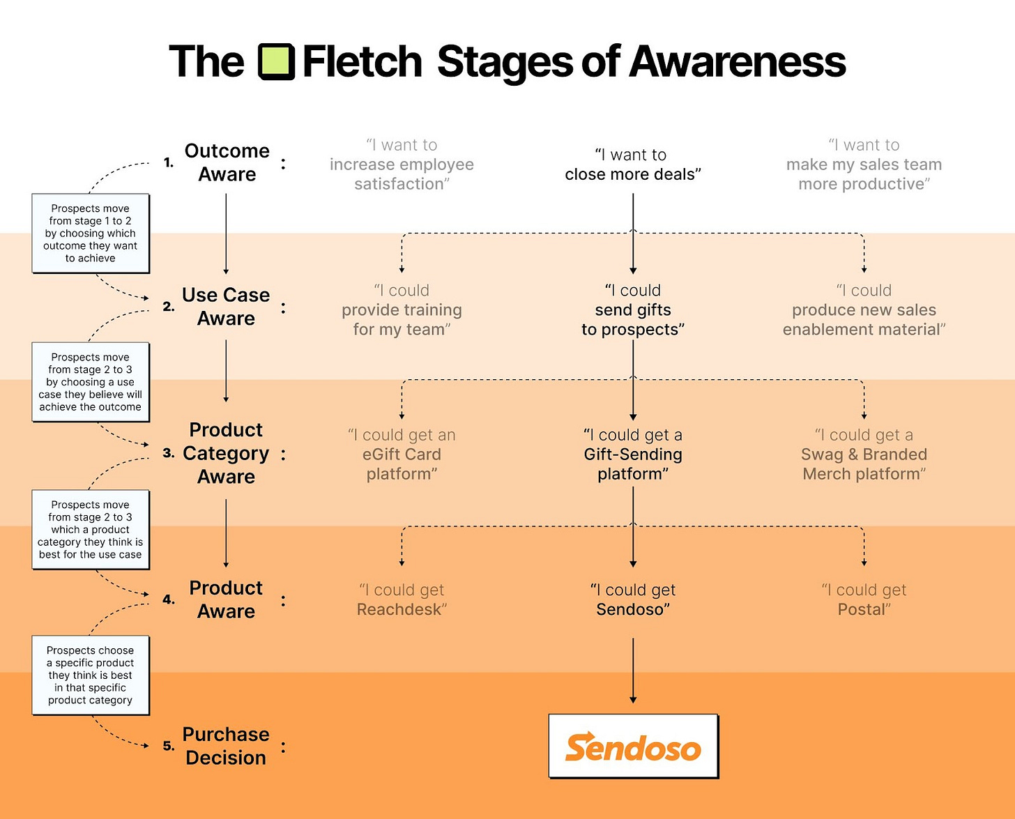 - Outcome Awareness. At this stage, prospects are aware of different potential outcomes they want to achieve. Outcomes as intended here refers to the JTBD definition according to Bob Moesta — the process a consumer goes through when they aim to change their existing situation into a preferred one, but cannot do so because of constraints that stop them. In the case of Sendoso: